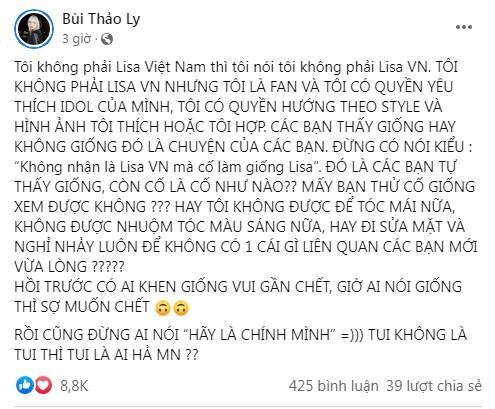 Tôi không phải Lisa Việt Nam, nhưng tôi là fan và tôi có quyền yêu thích thần tượng của mình. Tôi có quyền hướng theo phong cách và hình ảnh tôi thích hoặc tôi hợp”.